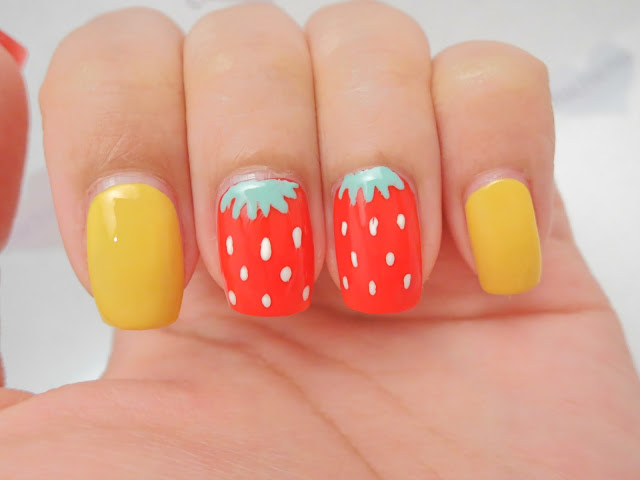 Time for some strawberries / blueberries picking! I loving berries picking! To match my nails to this time of the year, here I have painted my nails as strawberries. Did this with a toothpick! So, that's why the lines aren't very defined.